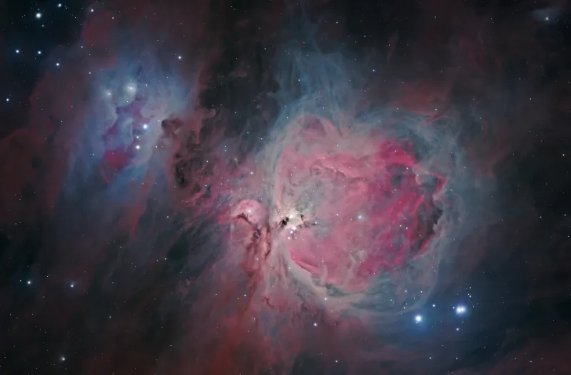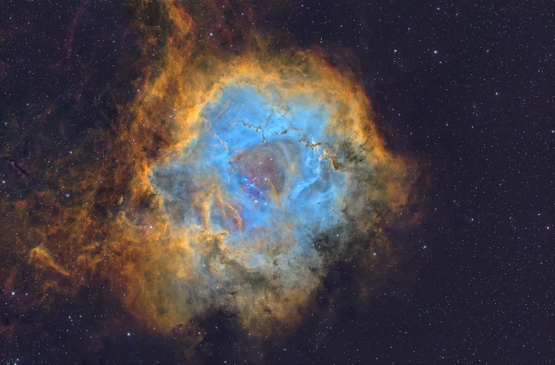 IC 443 (The Jellyfish Nebula) is a complex supernova remnant in Gemini, formed when a massive star exploded tens of thousands of years ago and its expanding shock front began interacting with dense surrounding molecular clouds. The result is a layered structure of ionized gas where hydrogen, oxygen, and sulfur trace physically distinct shock regimes—fast, high-energy filaments and slower cooling material—making IC 443 an ideal target for deep narrowband imaging. This image is presented in two narrowband interpretations: SHO to emphasize shock-excited oxygen and sulfur filaments HOS to preserve hydrogen dominance while retaining oxygen-rich structure along the expanding shell