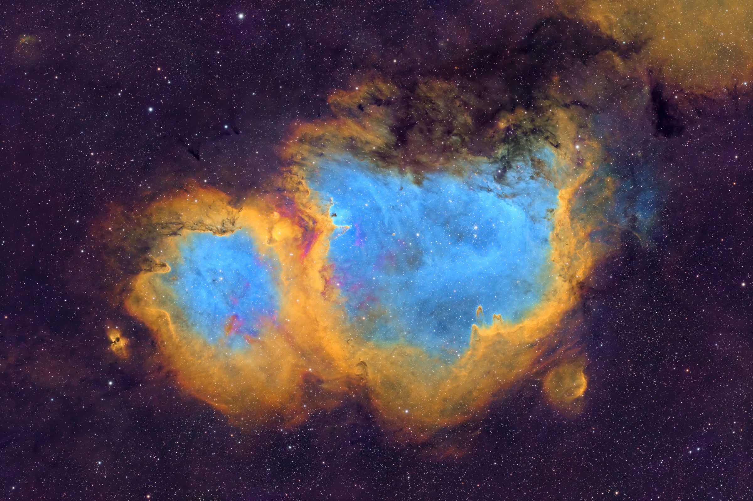 IC 1848, commonly known as the Soul Nebula, is a vast emission nebula and star-forming region located roughly 6,500 light-years away in the constellation Cassiopeia. Shaped by intense stellar winds and radiation from young, massive stars within the embedded open cluster, the nebula exhibits intricate pillars, shock fronts, and cavities carved into the surrounding hydrogen gas. This deep narrowband composition highlights the nebula’s complex ionization structure: hydrogen alpha traces the dominant emission regions, oxygen III reveals energetic excitation zones, and sulfur II outlines denser, sculpted features within the molecular cloud.