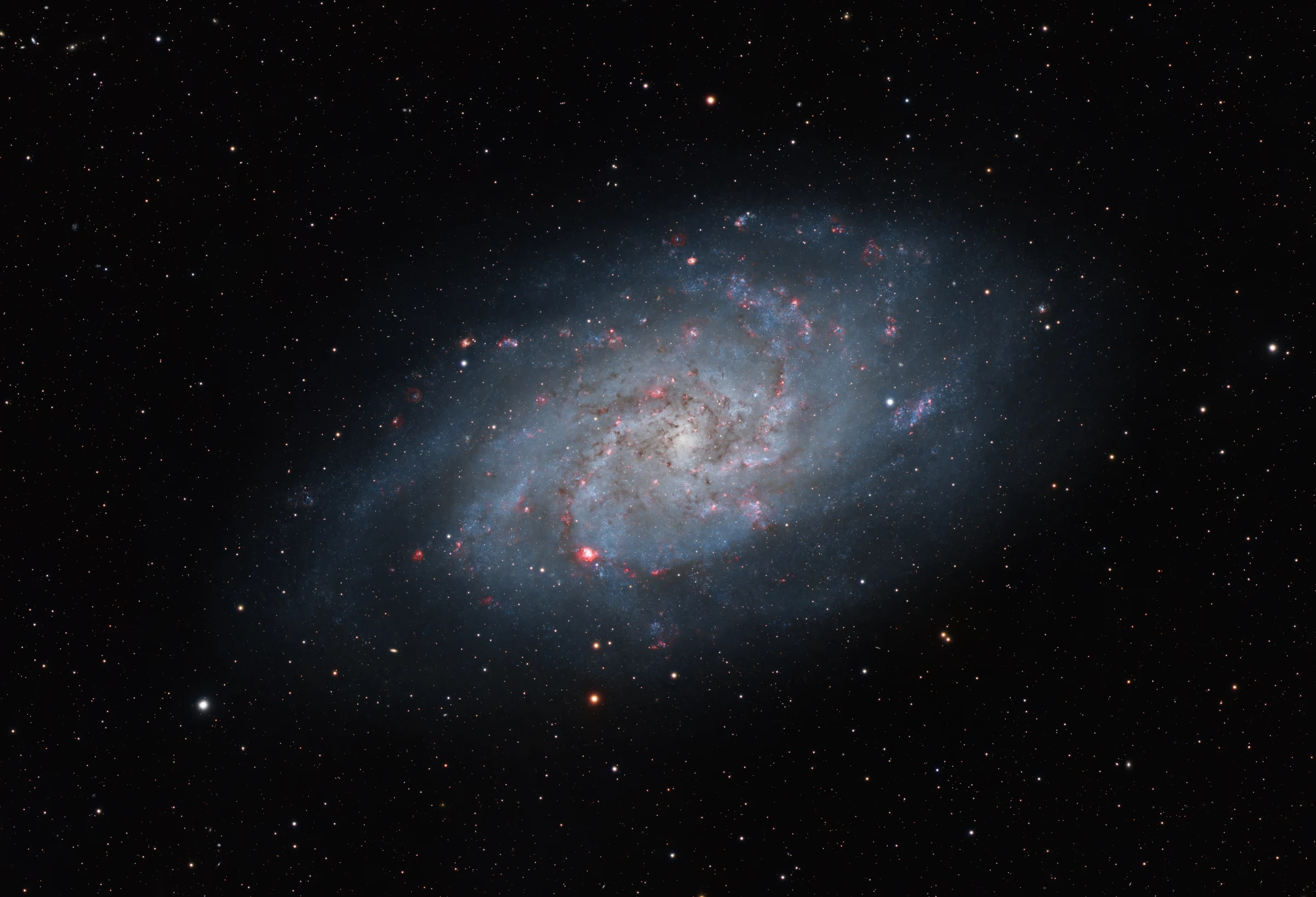 The Triangulum Galaxy (Messier 33, NGC 598) is a spiral galaxy located about 2.73 million light-years from Earth in the constellation Triangulum, making it the third-largest member of the Local Group after the Andromeda Galaxy (M31) and the Milky Way. Its diameter of roughly 60,000 light-years makes it about half the size of our own galaxy. M33 hosts extensive Ha regions—large clouds of ionized hydrogen gas—where intense star formation is occurring, most notably NGC 604, one of the largest known stellar nurseries in the Local Group.