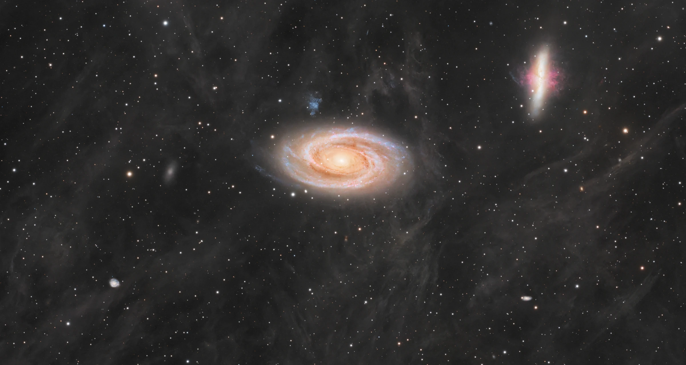 Messier 81 and Messier 82 are a nearby interacting galaxy pair located ~12 million light-years away in Ursa Major. A close gravitational encounter between the two galaxies triggered intense star formation in M82, producing powerful superwinds that expel ionized gas far beyond its disk. These energetic outflows are revealed here through deep H-alpha integration, while extensive broadband data resolves the delicate spiral structure and dust lanes of M81. This image combines deep LRGB data for fine detail and color fidelity with targeted H-alpha to highlight the dynamic starburst activity in M82.